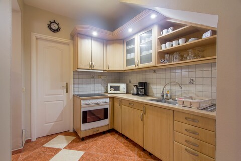 - Küche mit Ceran-Herd, Kühlschrank, Kaffeemaschine, Mikrowelle,