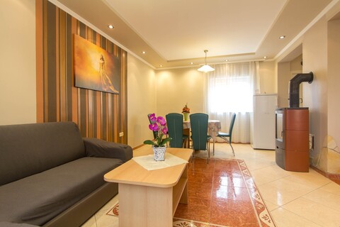 EG: Wohnzimmer mit Schlafcouch für 2 Personen, 1 Küche mit Essecke, 1 Bad mit Eckbadewanne und WC, Terrasse,